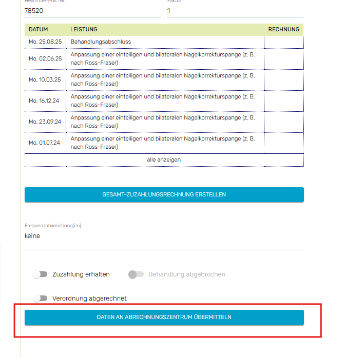 3. Wenn für die HVO alle Termine erfasst wurden und die verordneten Behandlungseinheiten erfolgt sind, können Sie die Daten digital an ARNI übermitteln. Klicken Sie dazu einfach den Button: "Daten an Abrechnungszentrum übermitteln".