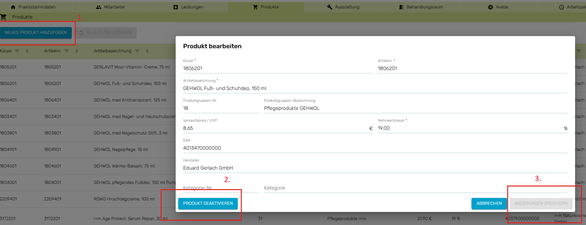 Neben den RUCK Produkten können Sie hier natürlich auch eigene Produkte hinzufügen (1), deaktivieren (2) oder bearbeiten und speichern (3).